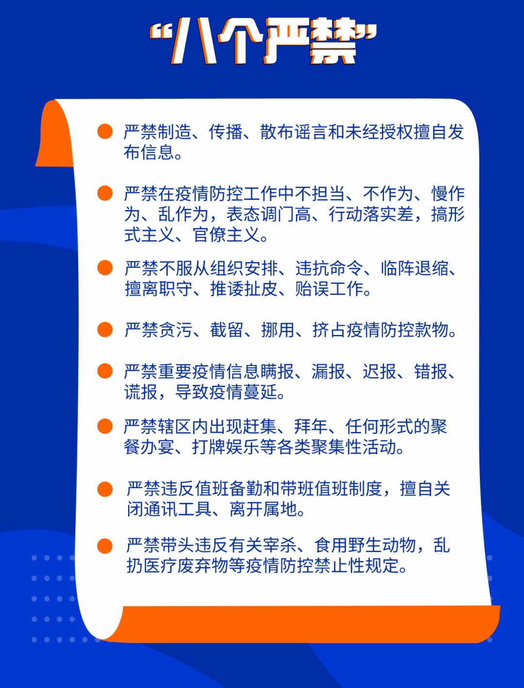 为认真贯彻习近平总书记关于疫情防控的重要指示精神,坚决落实中央、省委、市委和区委各项防控安排部署,达川区纪委监委要求全区各级党组织、全体党员干部严格遵守“八个严禁”,为坚决打赢疫情防控阻击战提供坚强纪律保障。